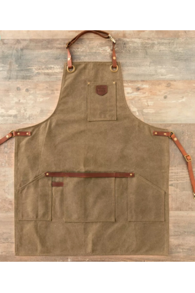 Autentisk lær og vokset lerret forkle fra franske Alaskan Maker. Dette forklet er ultra robust, den har praktiske lommer og er lett å rengjøre.
