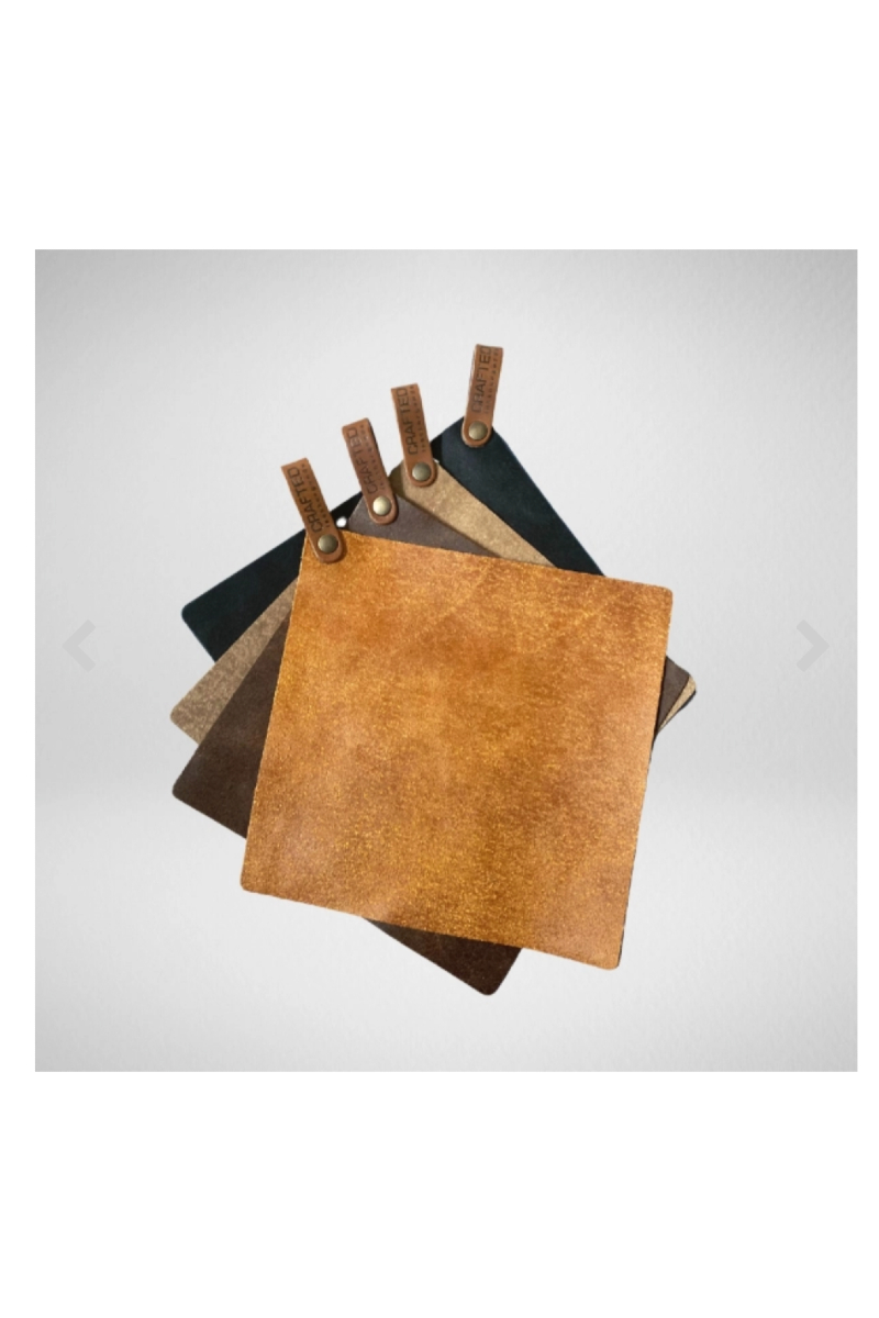 Håndlaget og eksklusiv gryteklut i 100% skinn med hempe i hjørnet for oppheng. Størrelse 21 x 21 cm.