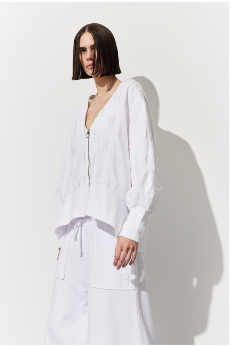 Nellie jakken med glidelås er laget av 100% bomull og har et vevd H design sydd inn i plagget. Jakken er litt lenger bak enn foran