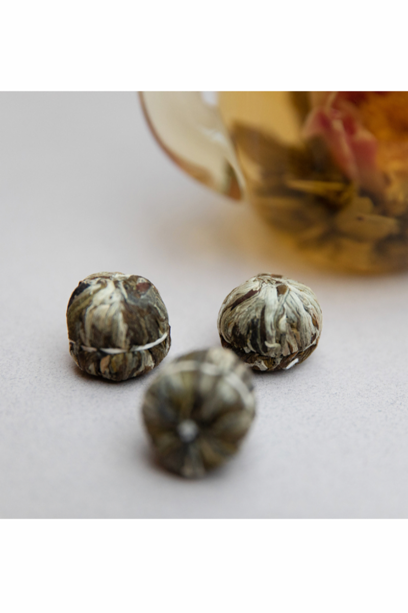 Håndknyttede "teblomster" i form av kuler, som folder seg ut til en blomst under brygging. Kulene er laget av den hvite teen Silver Needle og ulike typer blomster: sjasmin, rose og ringblomst.