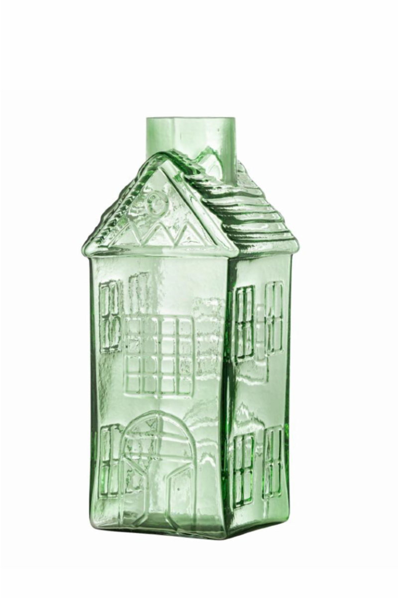 Nydelig grønn farge på vasen som er formet som et hus. Ideel til å ha noen kvister i
