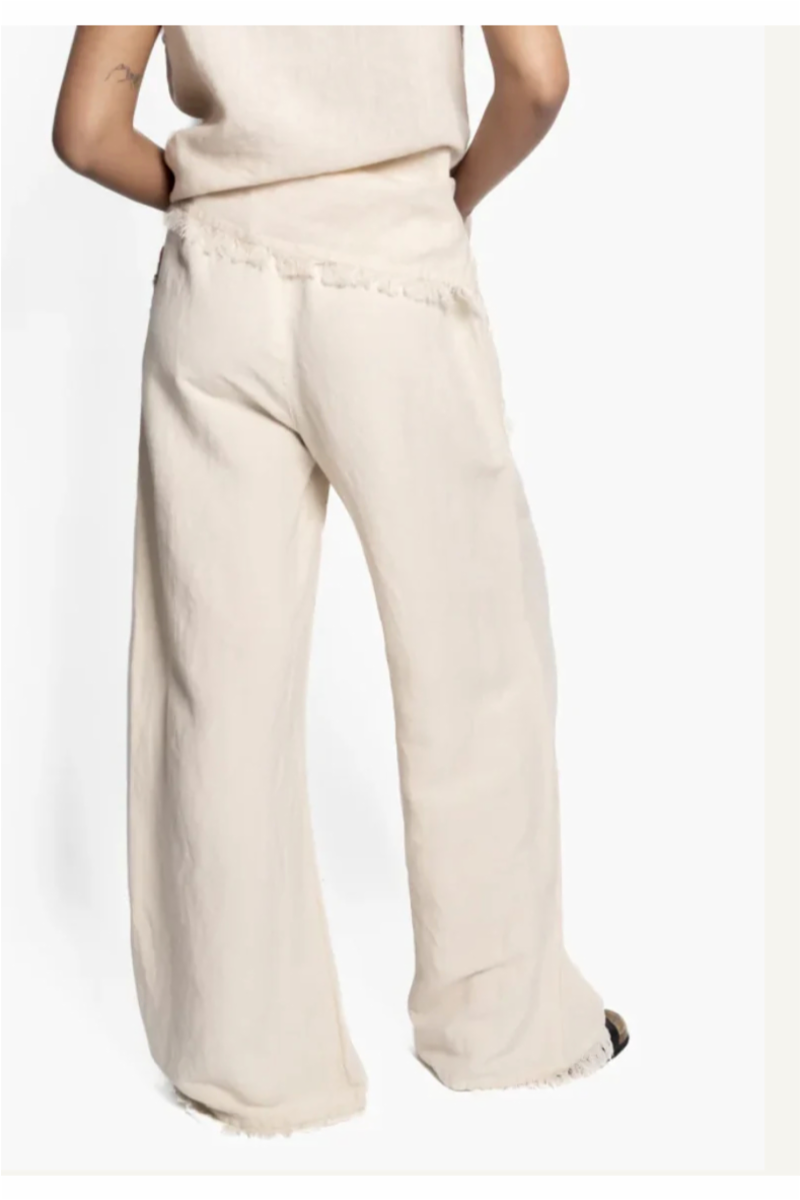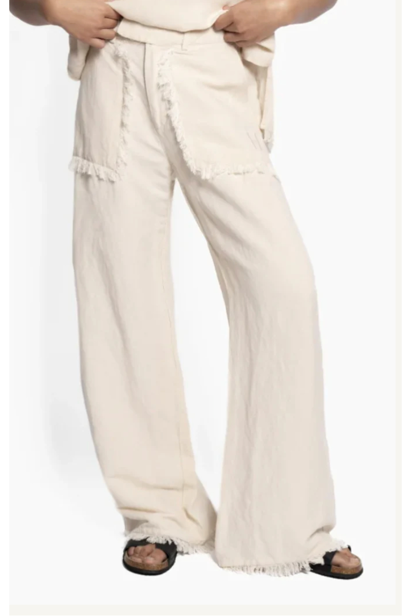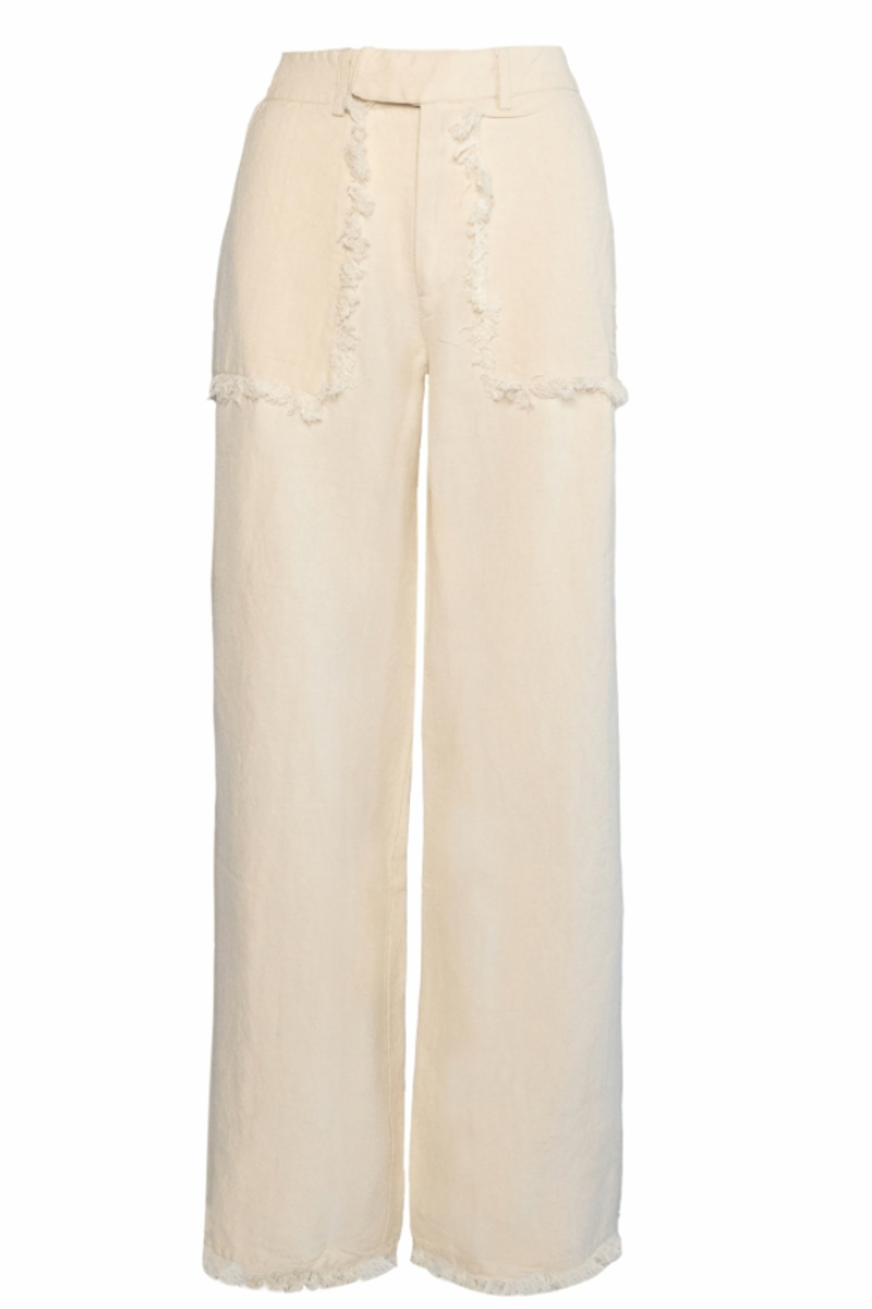 Stilige lin bukser med frynsedetalj på lommene, høy på livet