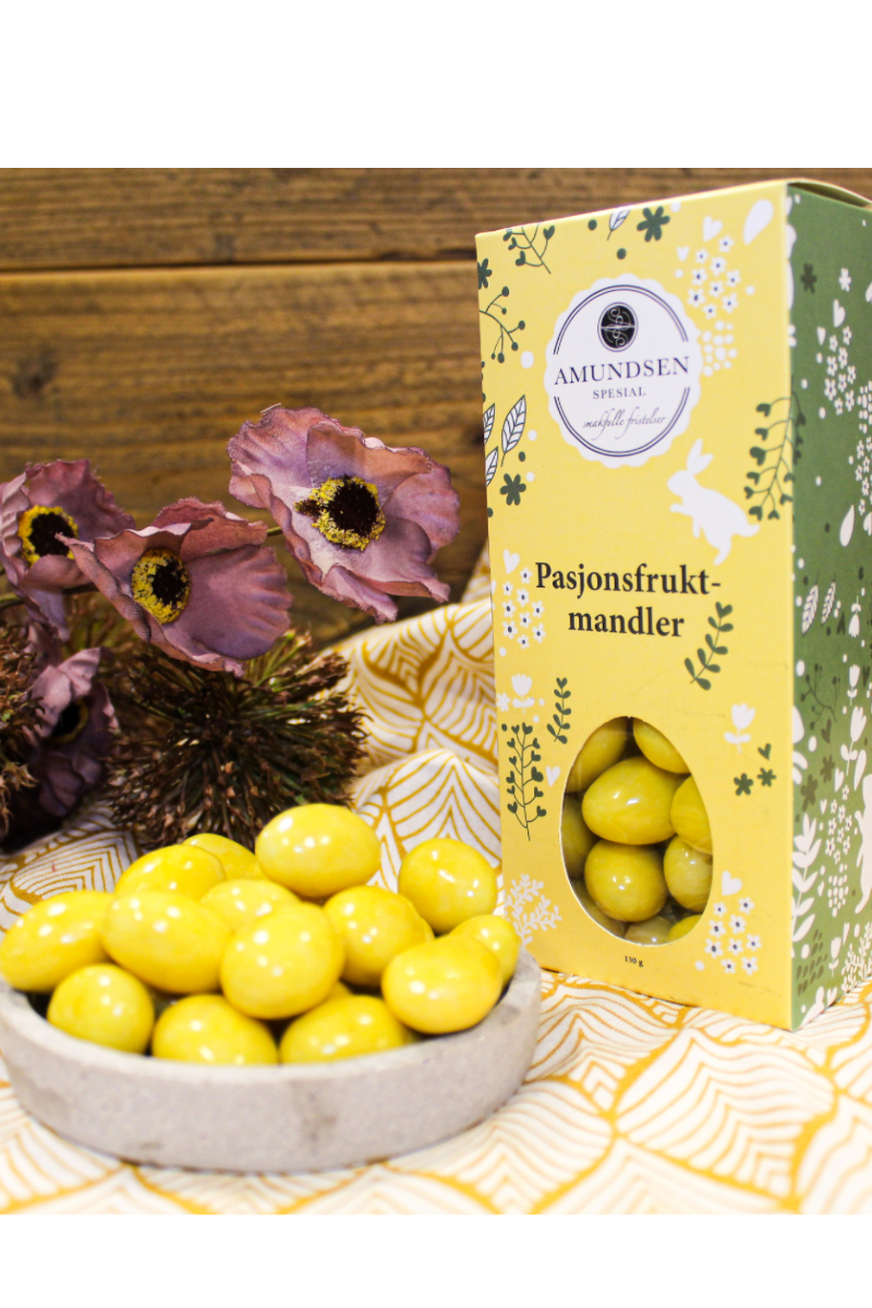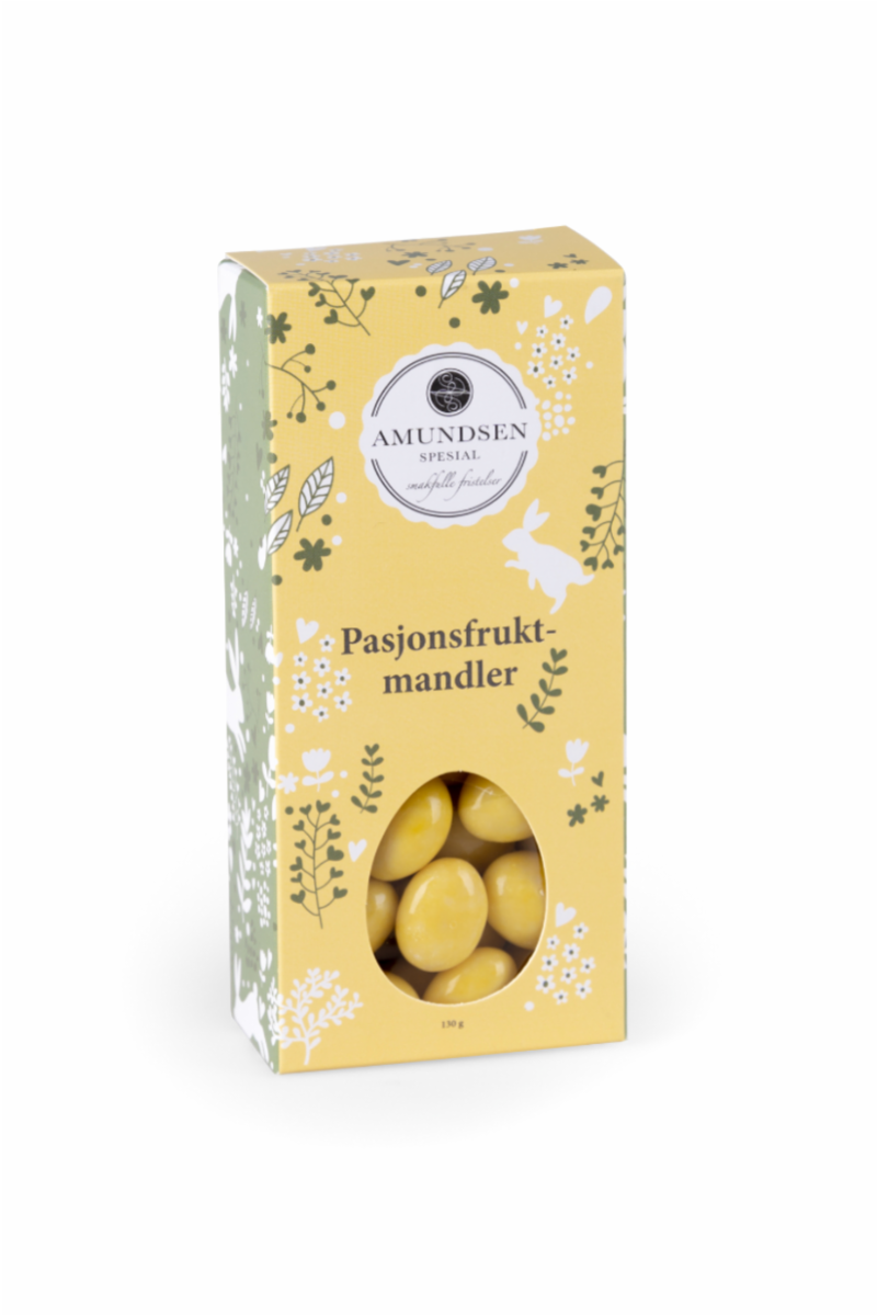 Ingredienser: Sukker, MANDEL (20 %), kakaosmør, HELMELKSPULVER, MYSEPULVER, LAKTOSE, konsentrert pasjonsjuice, surhetsregulerende middel (eplesyre, natriummalat), emulgeringsmiddel (SOYALECITIN), naturlig pasjons aroma, naturlig vanilje aroma, farge fra konsentrat (safflor), E904, glukosesirup, modifisert tapiokastivelse, vegetabilske oljer (kokos, raps)