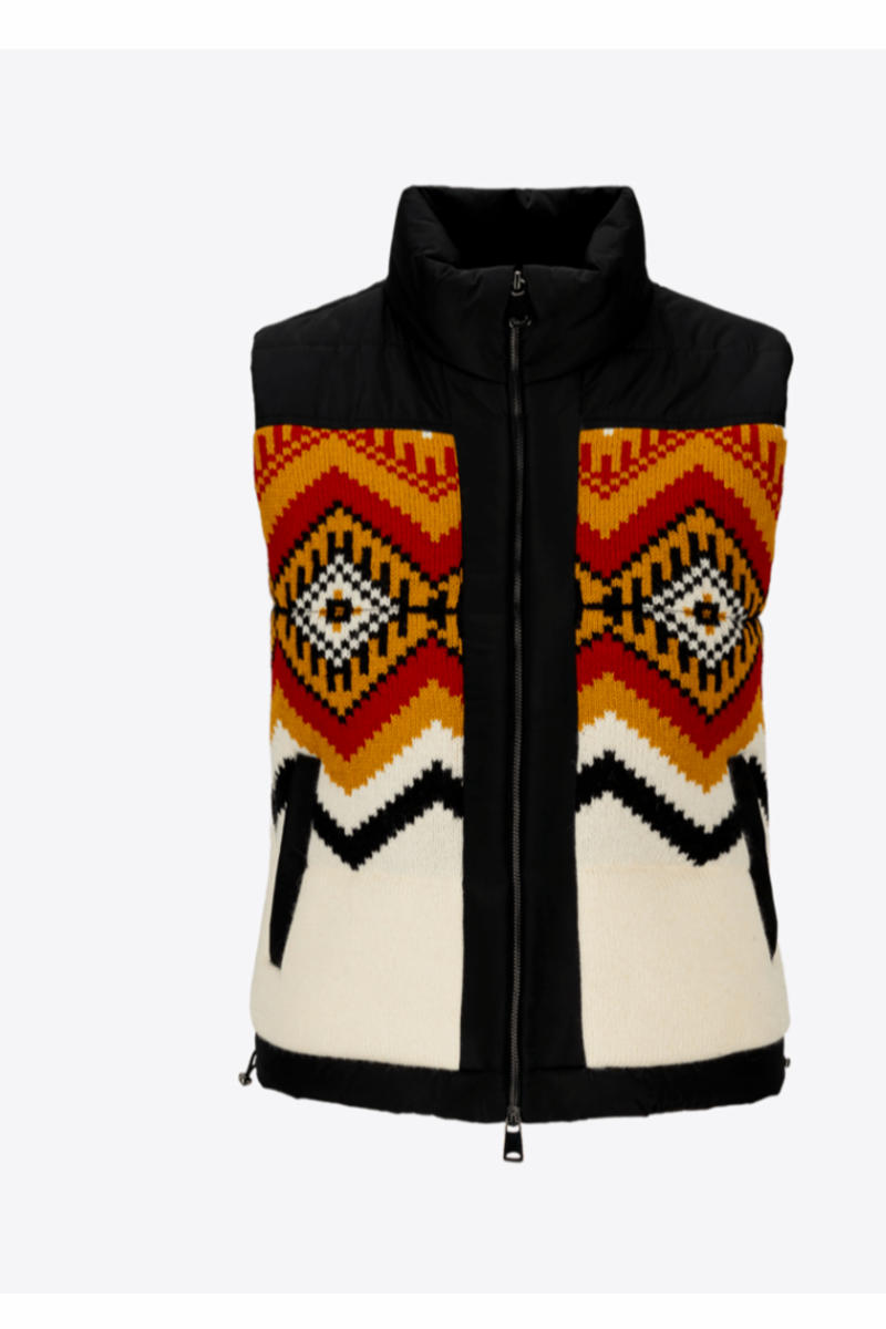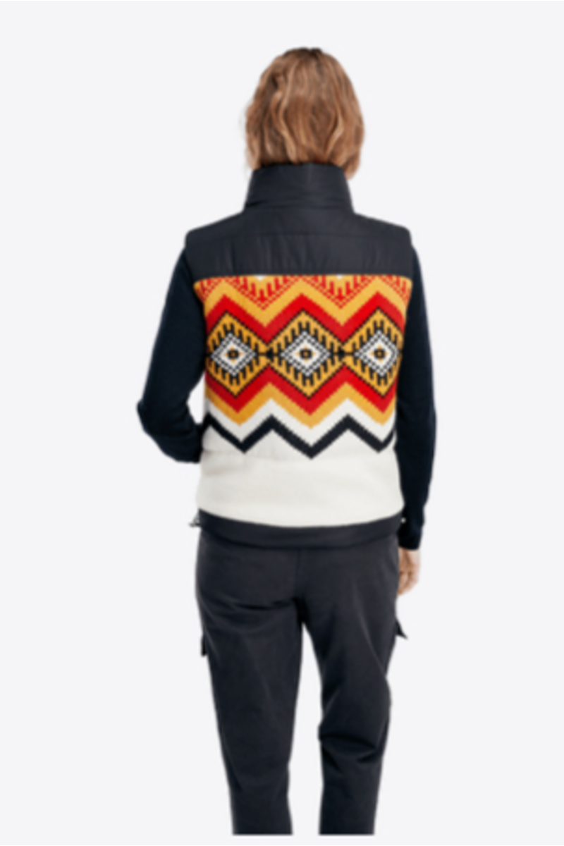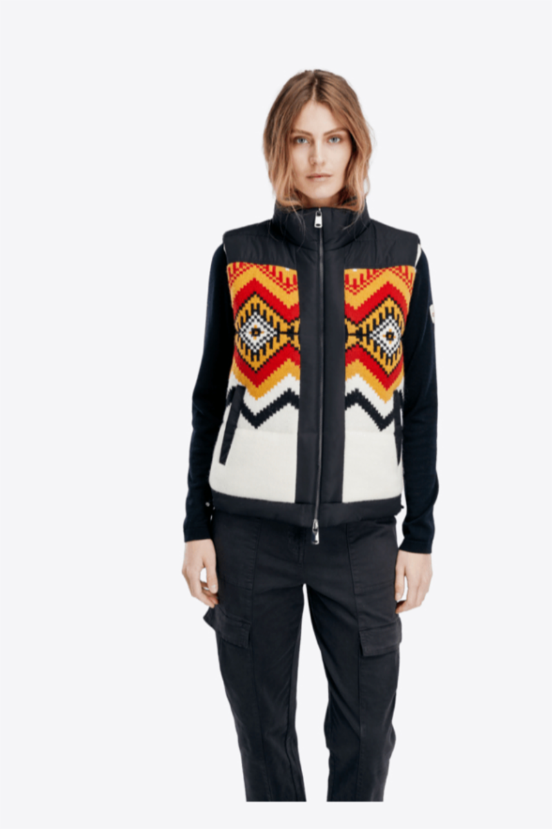 The large-patterned, feminine and boxy Skåla is a hybrid between a knitted and a woven vest. Skåla is fully lined with a soft stand collar and easy two-way zip closure. The vest is warm, windproof and water-resistant. The comfortable fit provides ample freedom of movement and makes this vest perfect to wear both on the slopes and in the city.