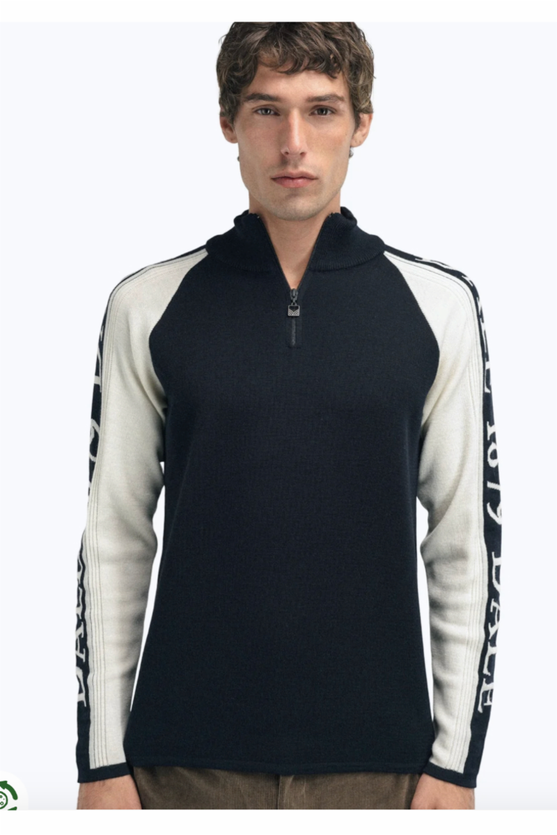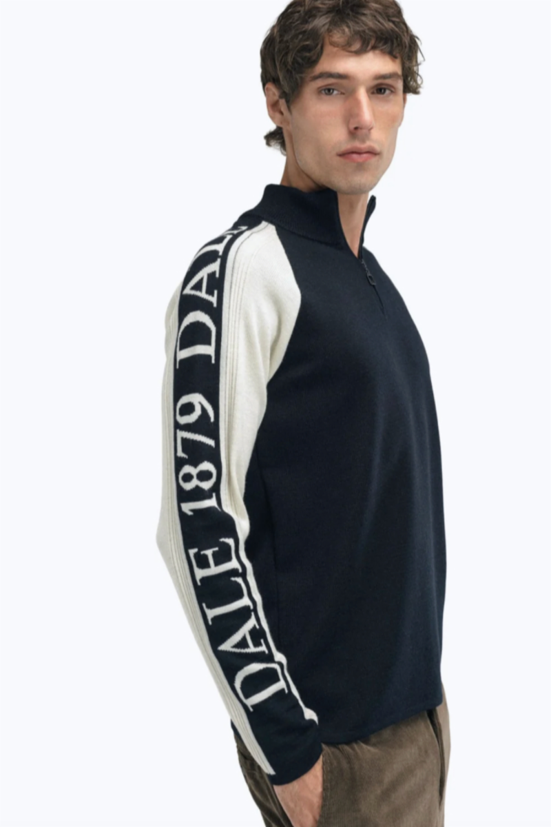 En myk og sporty genser med kontrastfargede ermer, rent linjespråk og halvhøy hals med glidelås. Dobbelt lag myk merino-ull strikket sammen med en fleksibel tråd, gir en behagelig stretch-effekt og svært holdbar passform. Denne mellomlags-genseren kan også brukes som en next-to-skin-genser. Langs ermene er teksten «Dale 1879» strikket inn. Dette viser til årstallet vårt eventyr startet.