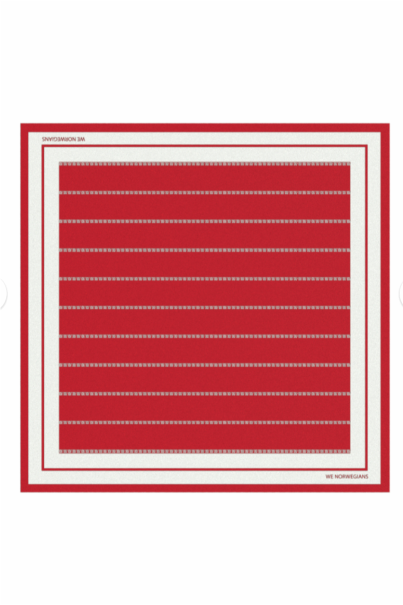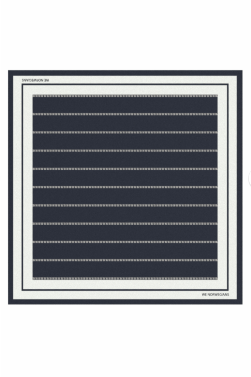 A timeless accessory with a nod to vintage sailor style - this silk scarf is crafted in a soft twill weave with a fluid drape and subtle sheen. Measuring 56 x 56 cm, it’s the perfect size for tying at the neck, wrist, or on the handle of a bag. The design features a stripe motif made up of printed We Norwegians symbols, creating a refined graphic pattern that feels both modern and nostalgic. Hand-stitched rolled edges highlight the craftsmanship, while the pure silk construction ensures a luxurious feel against the skin. Elegant, versatile, and effortlessly chic - a classic piece inspired by 1960s coastal glamour.