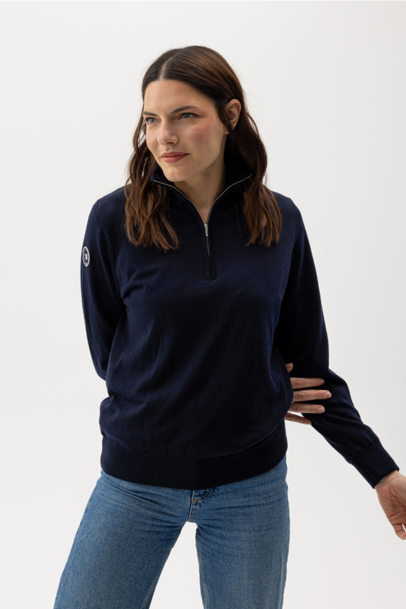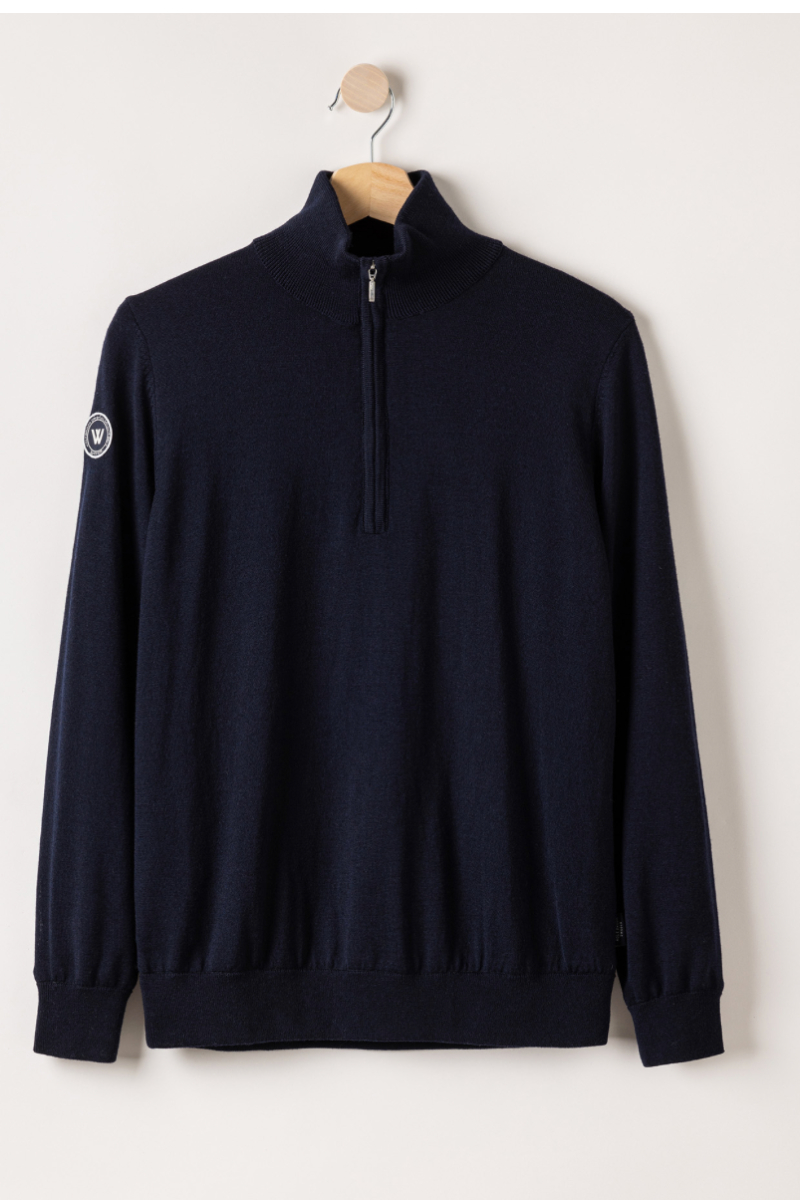 Windproof plain knit sweater with collar made of 100% extra fine merino wool. Fine knit, regular fit and ribbed collar with zipper. Ribbed cuffs at the end. Suitable as a midlayer but also for light outdoor activities such as golf. The sweater has a windproof stretchy lining consisting of 96% polyester and 4% elastane. No chemicals are used to achieve the windproof function. Instead, the lining is manufactured with a special weaving technique that makes the fabric extremely tightly woven and therefore also windproof, while the fabric is breathable. The elastane makes the fabric stretchy, which means that it stops the wind but not movement. The lining is labeled with ÖKO-tex® Standard 100, which guarantees that the fabric is free from harmful substances. Sustainably produced in Europe.