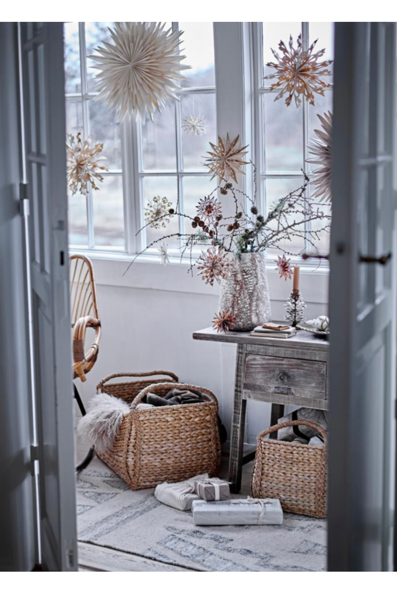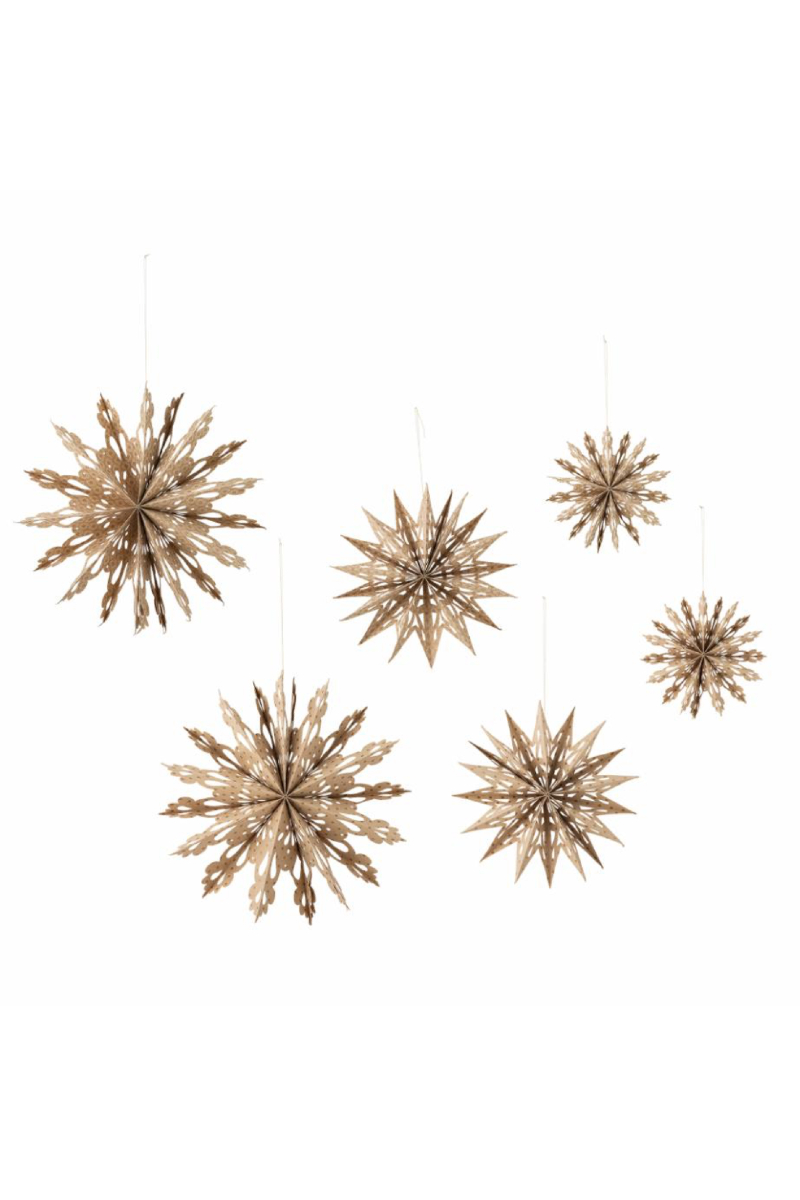 Star Ornamentet fra Bloomingville er et sæt med seks elegante papirstjerner i tre forskellige størrelser. De er fremstillet af printet papir med fine hulmønstre og udstyret med gyldne snore, der gør dem nemme at hænge op. Perfekte til juletræet, vinduet eller som en del af en festlig dekoration. Sættet leveres i en smuk papirgaveæske, hvilket gør det til en oplagt gaveidé til julens hyggelige anledninger.