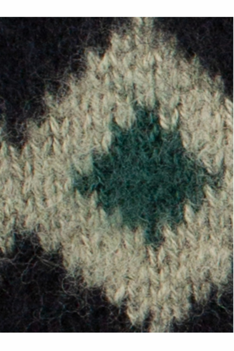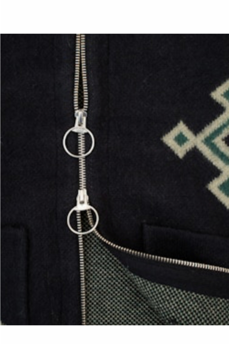 Nydelig strikkejakke i mørkeblå farge med hvitt og grønt jacquard mønster i ull fra det ikoniske merket Pendleton.