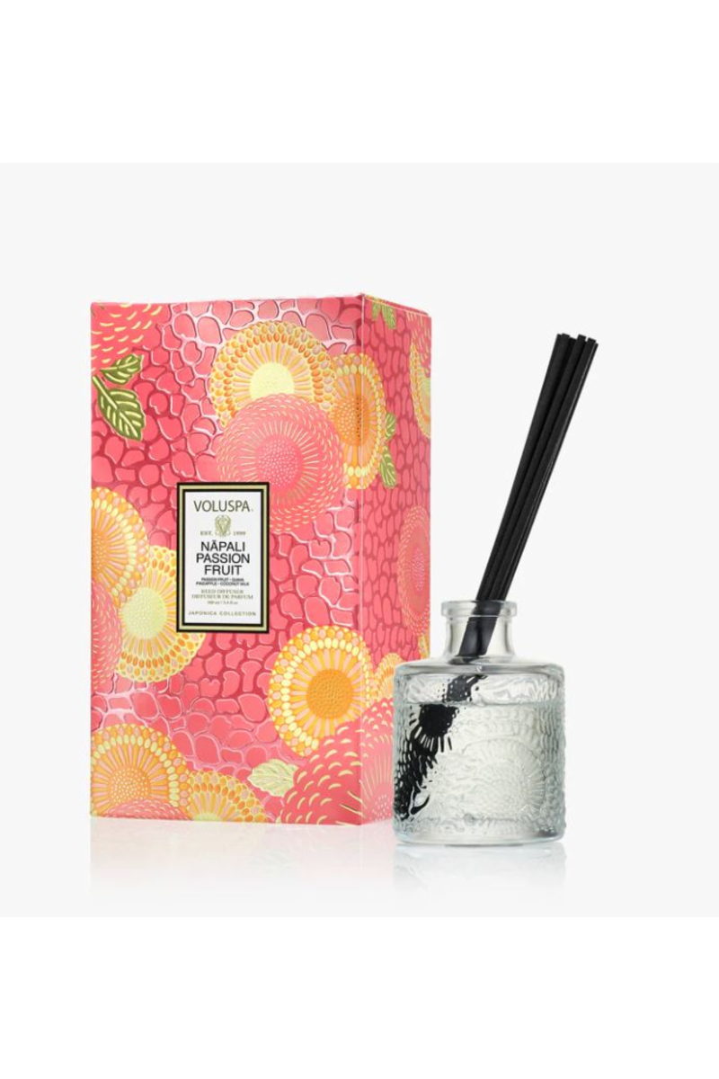 Voluspa Nāpali Passion Fruits Reed Diffuser er en elegant duftpinne-diffuser som bringer deg rett til paradis med sin forfriskende og fruktige aroma. Duften kombinerer solmoden pasjonsfrukt, saftig guava, gyllen ananas og kremet kokosmelk, og skaper en livlig og oppkvikkende atmosfære. Inspirert av eksotiske øyer, gir lyset et tropisk preg til ethvert rom. Diffuseren leveres i en dekorativ flaske som fungerer både som stemningsskaper og som en stilfull interiørdetalj – perfekt som gave eller til eget hjem.