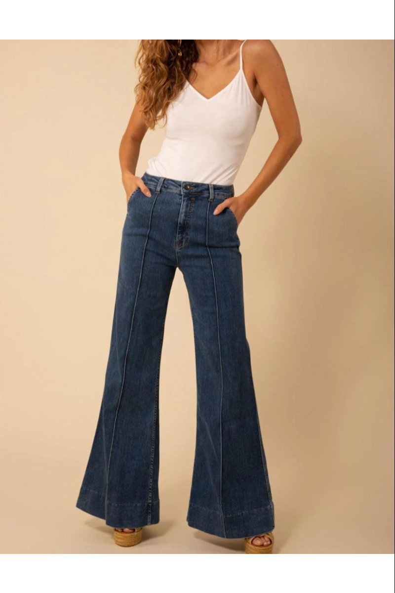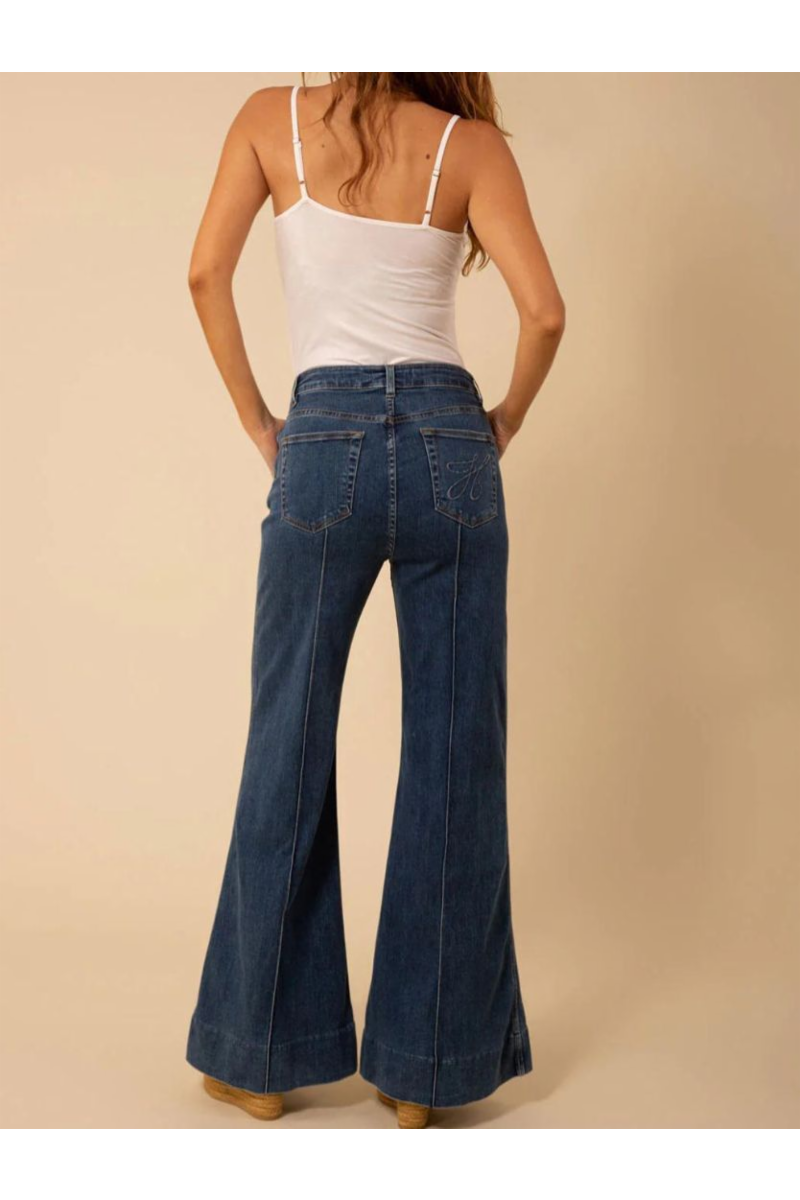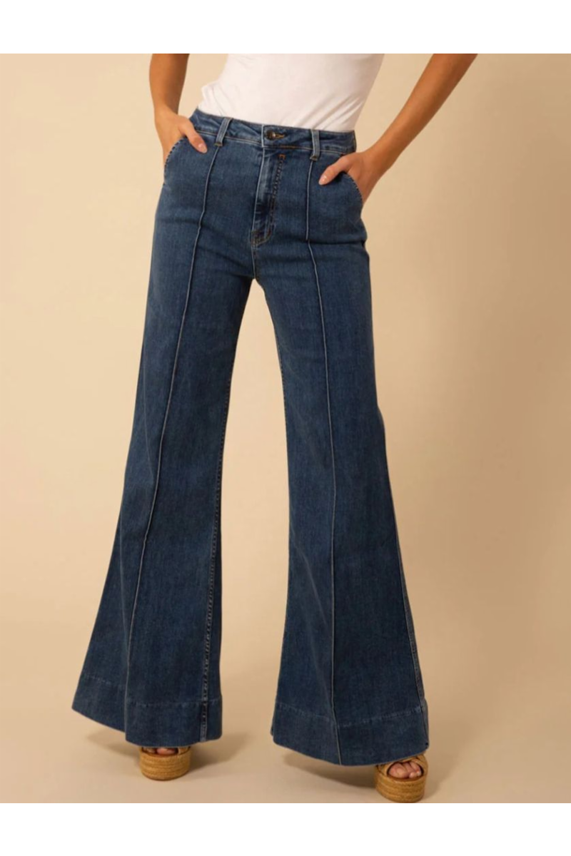 Blake Flare Leg Denim Trouser fra Hale Bob er et par stilfulle jeans som kombinerer vintageinspirert flair med moderne passform. Den høye midjen og de utsvingte bena skaper en flatterende silhuett som forlenger bena og gir et sofistikert uttrykk. Laget av mykt og elastisk denim for optimal komfort og bevegelsesfrihet. Et perfekt valg for en tidløs, men trendy stil.