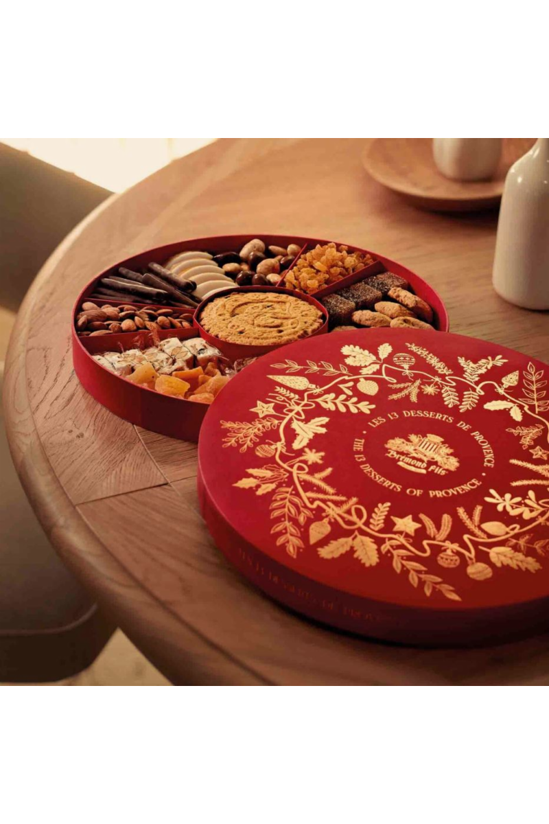 I løpet av advent, de fire ukene før jul, forbereder hver provençalske familie seg til høytiden med en rekke tradisjoner. I Provence er det vanlig å tilby sine gjester et utvalg av tretten desserter på julaften. I tradisjonens tro settes disse frem etter julemiddagen, og står fremme til 27. desember, slik at hele familien kan småspise søtsakene gjennom juledagene. Alle må smake på de 13 ulike dessertene, ellers bringer det ulykke for det kommende året. Vår gaveeske viderefører denne tradisjonen med et utsøkt utvalg av typiske provençalske søtsaker. Den elegante metallboksen, dekorert med julens farger og illustrasjoner, inneholder deilige fristelser som skal nytes på julaften. Rundt det sentrale «gibassier»-bakverket finner du det beste Provence har å tilby.
