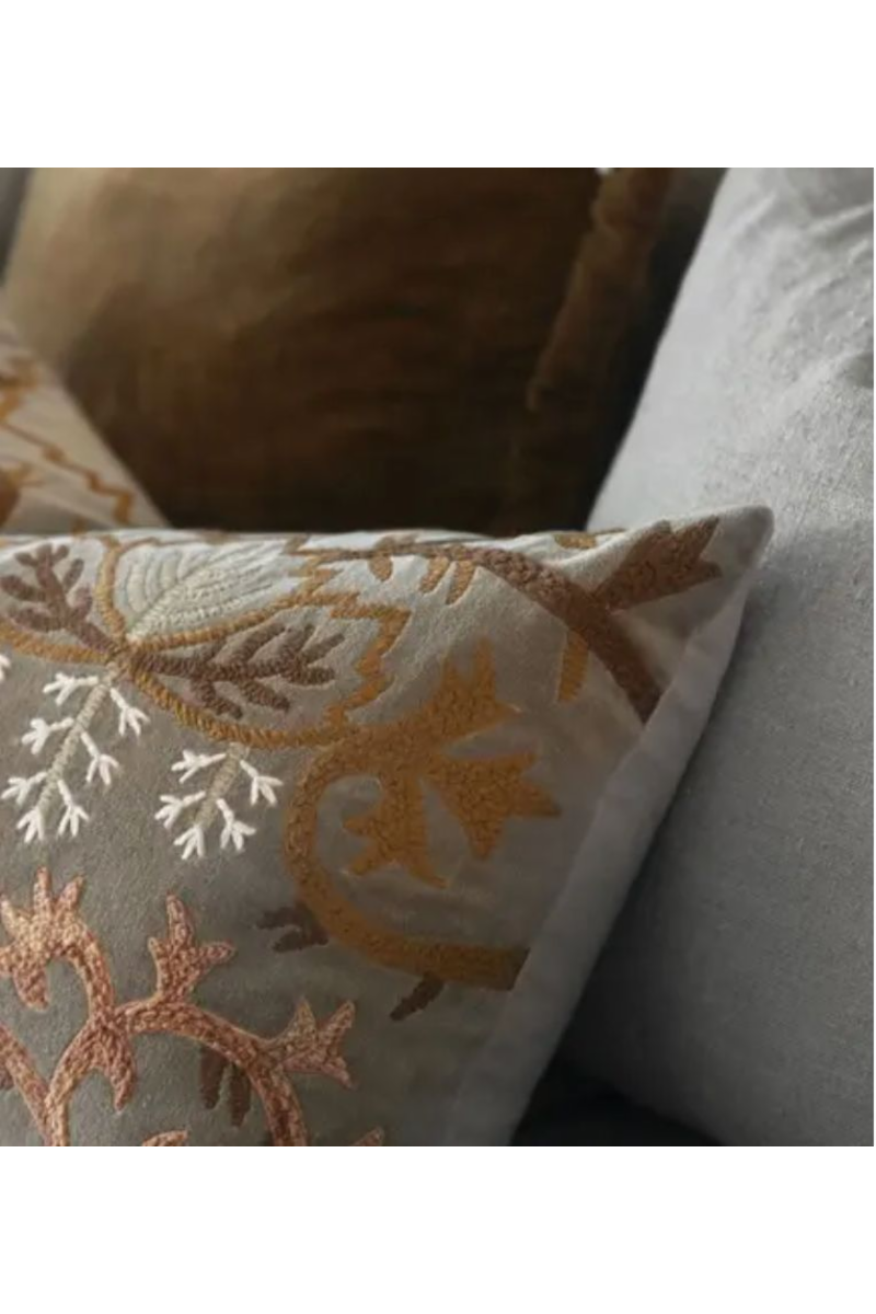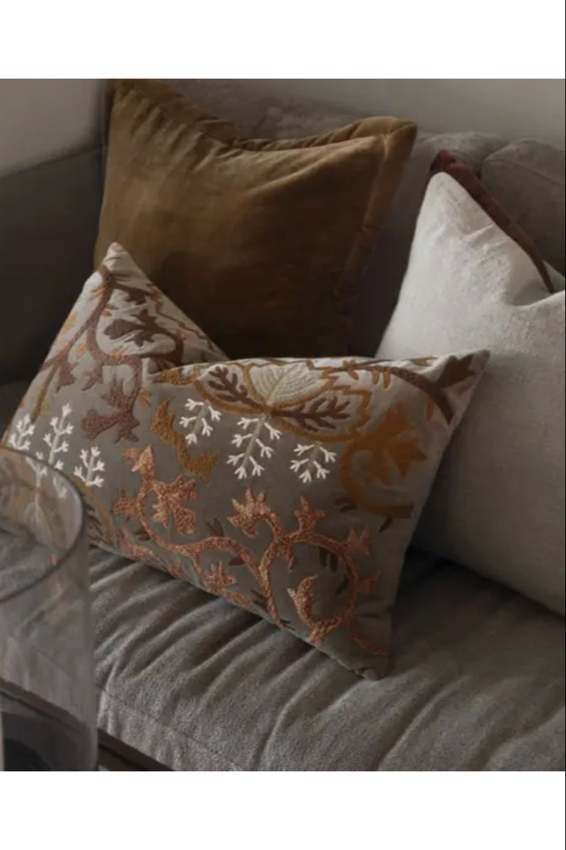 Putetrekk i myk velour med detaljerte broderier på forsiden. De varme, brente tonene gir et elegant og tidløst preg, perfekt for å skape en koselig og stilfull atmosfære i hjemmet.